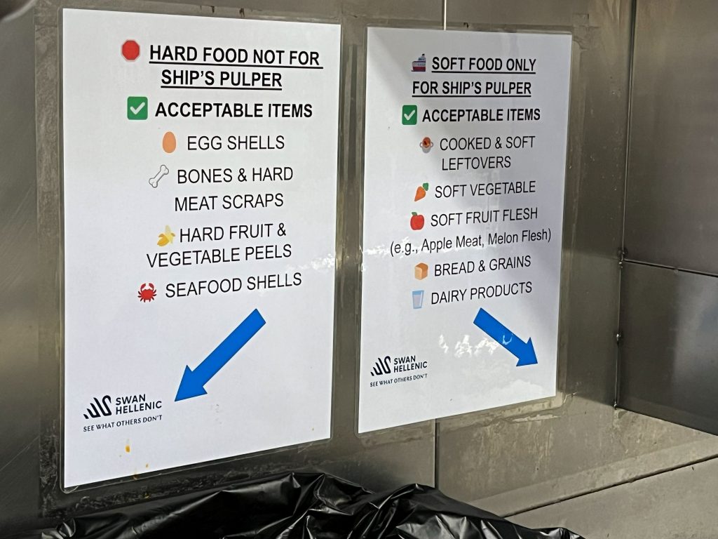 The kitchen separates food according to what can be safely put out to sea (not near a shore) and what needs to go back to port for disposal.