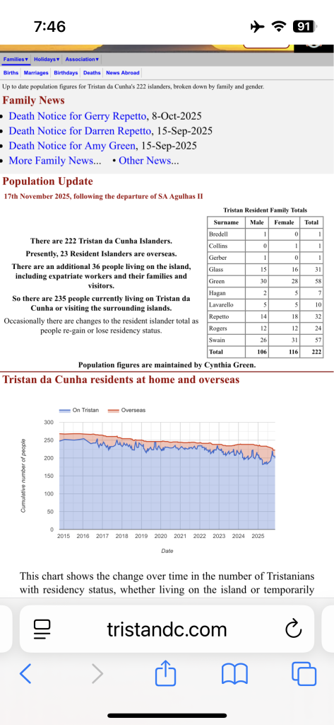 I know on our island deaths — any deaths — hit the community hard. When you don’t have many community members, each is extra-valuable. I can’t imagine how the TdC community is hit by a death when the deceased is surely certain to be a close friend, if not a relation. Unless, of course, it’s one of the few visiting workers the Tristinians call ‘station fellas’, such as the doctor or the Administrator appointed by the British Government.