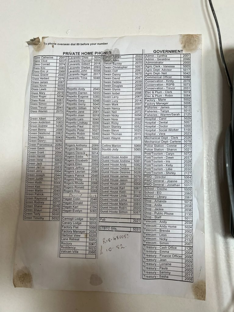 The phone book (or, rather, phone page) is also testament to the seven families. This one I spotted beside a phone hanging on the wall of the community’s sole bar.