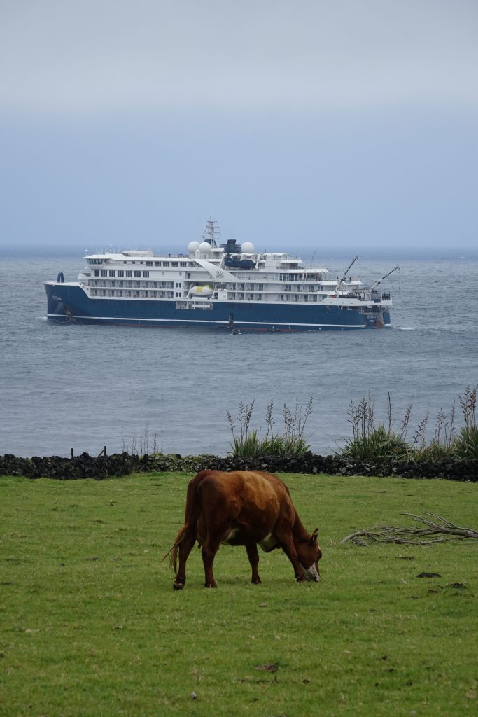 And the view from the cemetery is fabulous. When I look up, I can see the SH Diana anchored off shore. A Zodiac is zipping towards ‘The Settlement’ as the town, Edinburgh of the Seven Seas, is called locally. In the foreground, a brown cow munches on the long green grass that the Islander’s ancestors worked since the first settlement in 1810 to hard to cultivate.