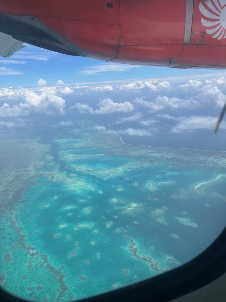 Upon landing, we were welcomed by a line of staff and drivers (that’s where I was first reminded of Fantasy Island: ‘the plane, the plane’). I was directed to the front seat of a small, recently cleaned, SUV. It seemed that every able vehicle in the village was drafted to the task of getting resort guests the six or so minutes from the airfield to the fishing port where a sizeable longboat awaited. The convoy parked bonnet to boot along the wharf; they’d have to reverse out one by one. Glad I wasn’t going to be there for that chore.