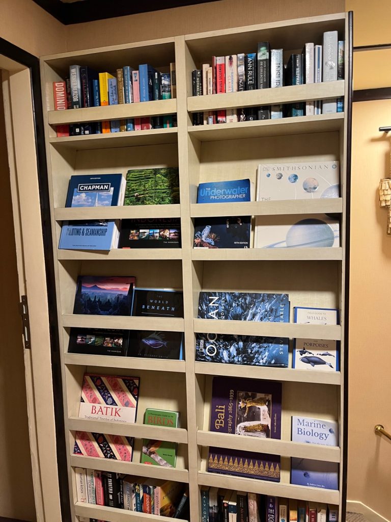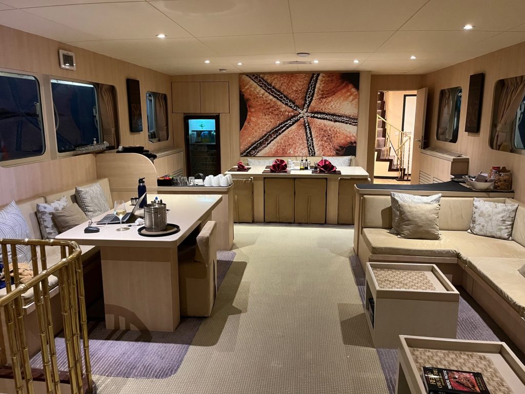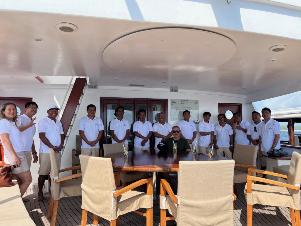 Another – or perhaps the same – Zodiac takes us from the long boat to the liveaboard. With one hand dutifully on Mali’s, I step up from the rubber onto the wooden ladder. There’s another line of staff waiting to greet us, Quickly I count thirteen. Not bad for four passengers. Not even bad for the eight or ten there usually is. The company says that for this week it received an unusual number of cancellations and thus we are four. (That’s Mike sitting at the table. He took many of the underwater photos in part two — thanks Mike.)