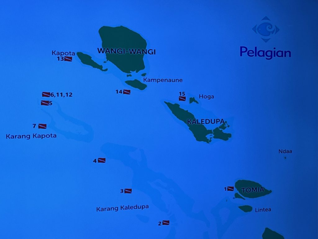 Wakatobi is an archipelago, home to Indonesia’s largest barrier reef, southeast of Sulawesi Island. We’re in the Banda Sea. The name ‘WaKaToBi’ comes from the names of four islands: Wangi-wangi, Kaledupa, Tomia, and Binongko. On one of the smallest islands is the Wakatobi Resort that is renowned for its scuba diving and its dive experience. And not without reason.