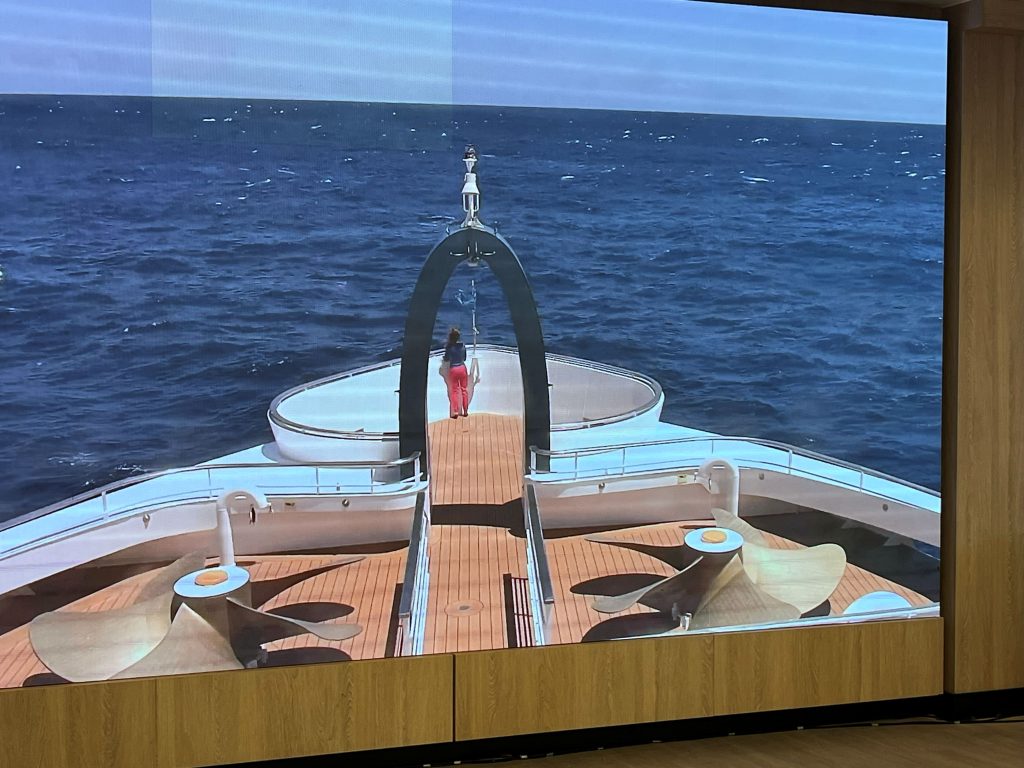 The ship’s bow is shown here via the ‘bow channel’. You can watch the ocean on the TV in your cabin (especially handy if you don’t have a balcony window). This bow is an homage to the movie Titanic, surely.