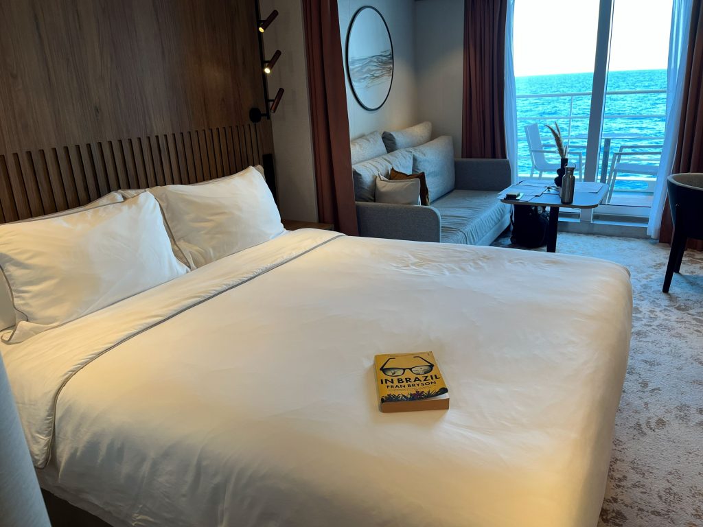 The cabin has pillows of duck down: scrumptious. There’s a bowl of smarties, a jar of dried fruit and a container of peanuts to accompany the soft drinks, beer and champagne thoughtfully left in my fridge. I immediately turned off the cabin’s fake wood fire. It’s not cold. Not yet. But it’s a bit too breezy to sit on my balcony for long. And yes, that’s a copy of my book In Brazil that I hope to give to the library on Tristan de Cunha (even though the Brazilian guest aboard has offered a small fortune to purchase it).