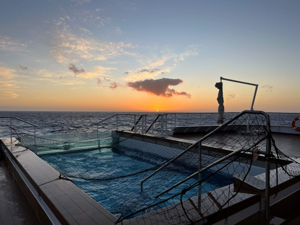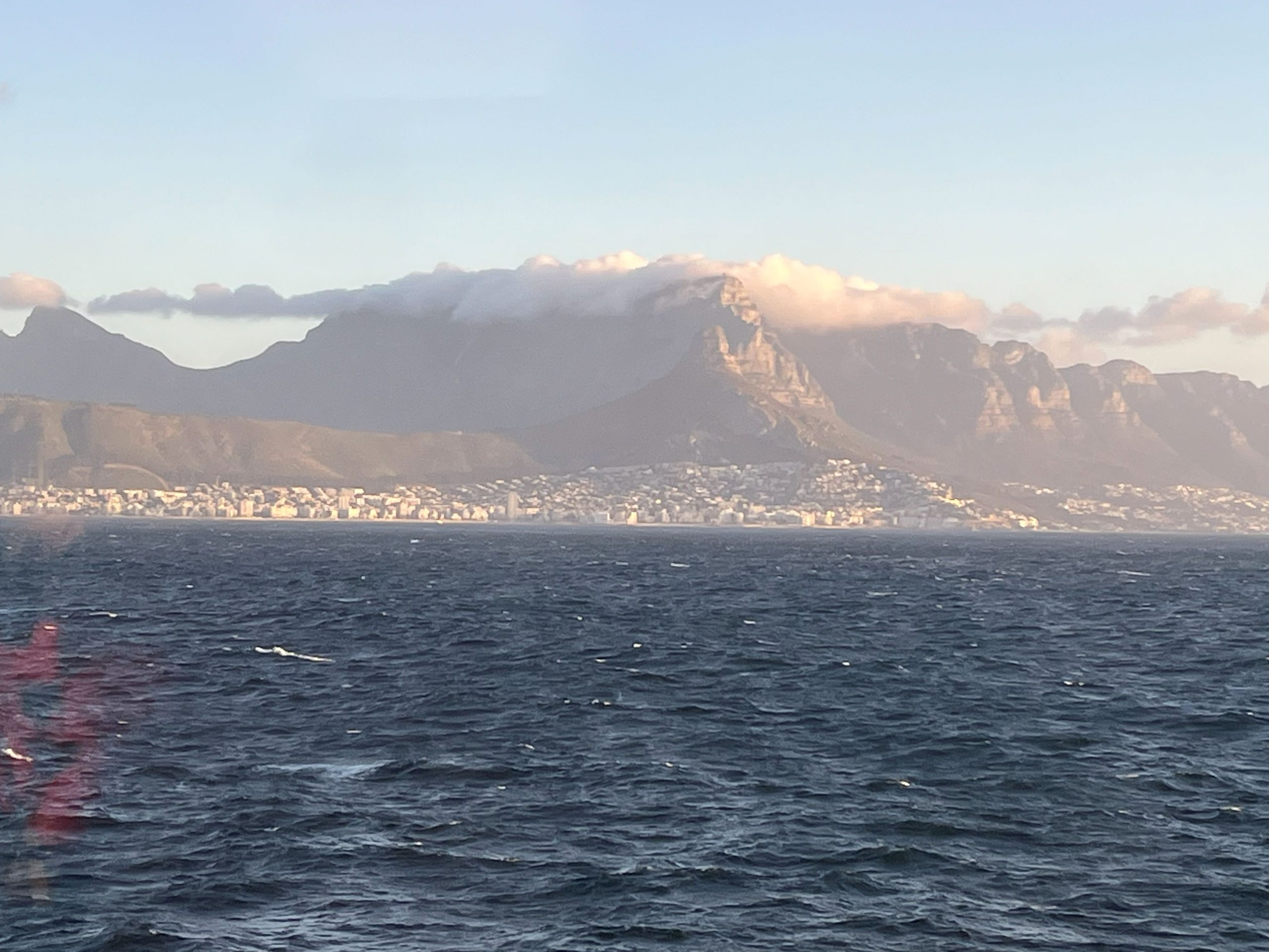 We said goodbye to Cape Town pretty much on time in the late afternoon on Saturday (right). Here’s our first sunrise over the rather choppy plunge pool (below).