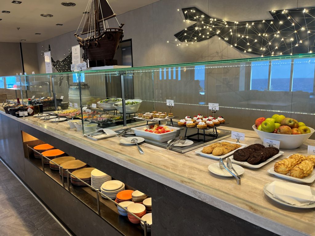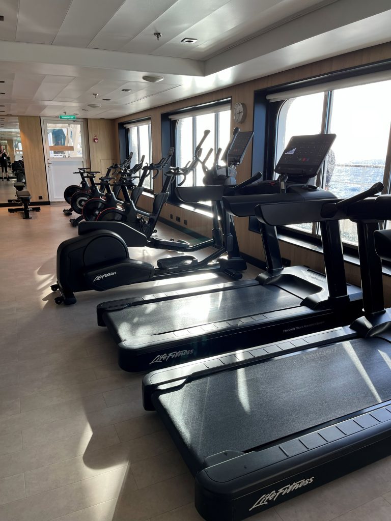 Breakfast, lunch and afternoon tea are served as buffets. Dinner is a la carte. There’s no chance any of us will be losing weight on this journey. A limited room service menu is available 24/7 and, while the restaurant is open, I can order anything they have to be delivered to my cabin where I can eat it on the balcony or the sofa, at the desk, or in bed. Lucky there’s a gym where you can run, walk, cycle or row whilst watching for whales. I tried to walk around the deck — promenade, if you will, like passengers used to do when ships were the only form of over-sea travel. But alas, there’s no single deck on which you can circumnavigate the ship. The pic is of the ‘light’ lunch buffet. Geesh, at least there’s fruit.