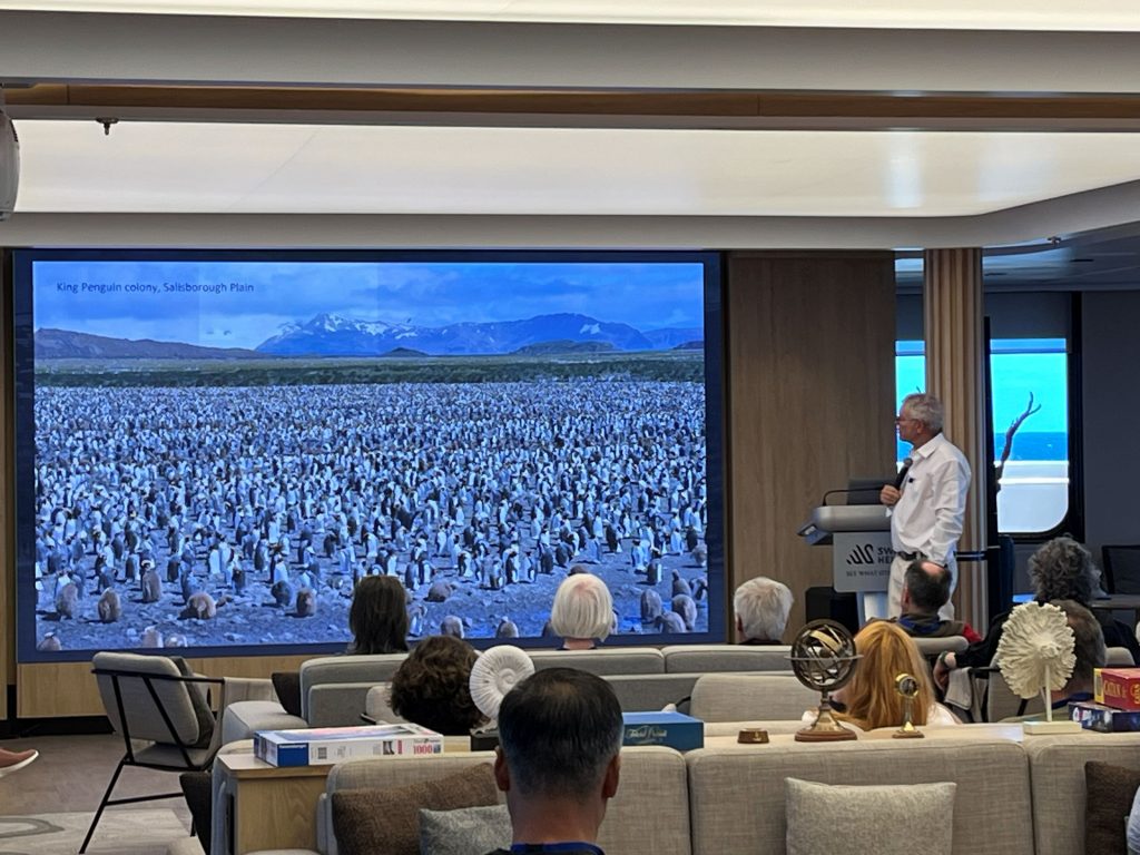 The ship has only been sailing since 2023 and is in fine fettle, with a wide central staircase and two shiny elevators. Someone with good taste chose the artwork that decorates the communal areas. The lounge where the lectures are held has state of art tech and no fewer than six screens so everyone can see the so far excellent PowerPoint presentations.